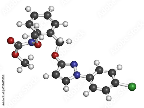 Pyraclostrobin fungicide molecule, 3D rendering.