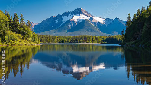 Pyramid mountain reflecting in pyramid lake on a sunny summer day