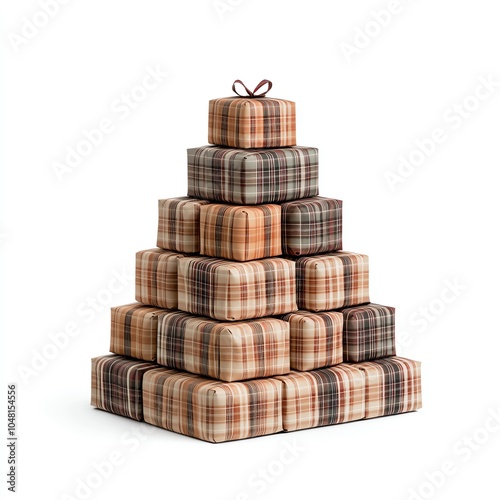 Pyramid of plaid gift boxes, white isolate background