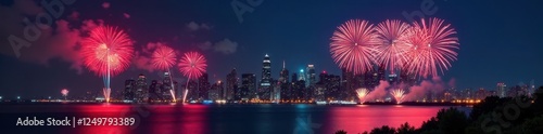 Pyrotechnic display over city skyline at night, fireworks, nighttime, winter