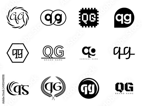 QG logo company template. Letter q and g logotype. Set different classic serif lettering and modern bold text with design elements. Initial font typography.