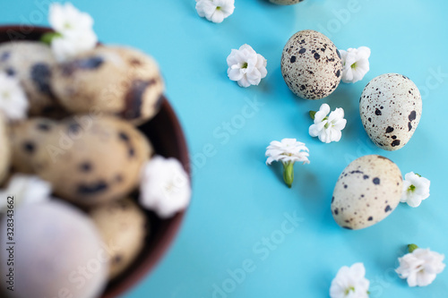 Quail eggs with white flowers on a blue background, focus on the far egg