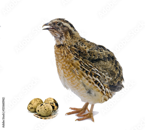 Quail with eggs isolated on white background