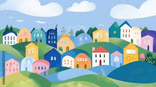 Quaint Hillside Village A whimsical scene of colorful houses nestled among rolling hills under a cheerful sky
