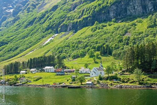Quaint village of Bakka nestled along the coast of the fjord mountains and forest in Aurland from an angle