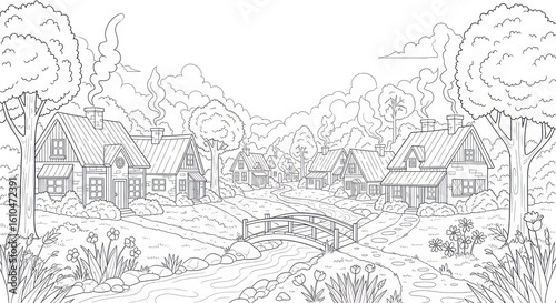Quaint village scene with houses bridge and stream