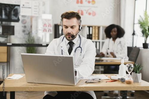 Qualified doctor in lab coat and gloves holding sterile syringe and talking during video conference on laptop. Male therapist in headset having online appointment with patient.
