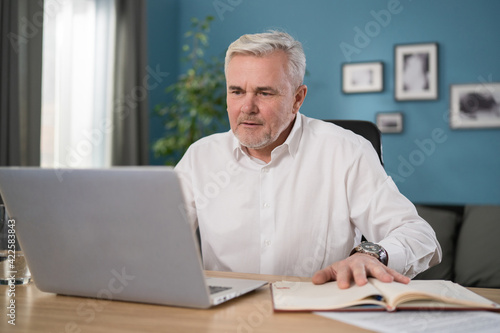 Qualified serious male businessman doing online research, reading news, making notes in financial journal. Focused old middle aged man using laptop writes down important information sits at office