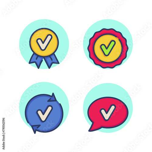 Quality approval badge icon set. Verification icon, check mark, feedback, reviews, speech bubble. Confirmation of quality, qualification concept. Vector illustration for web design and apps
