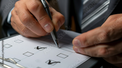 Quality Assurance and Document Control with Checklist Icons. Businessman mark off items on digital checklist, representing quality assurance and document control processes, verification and compliance