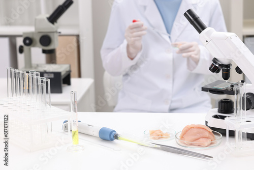 Quality control. Food inspector examining meat in laboratory, closeup
