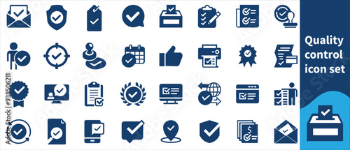 Quality control icon set. Containing inspection, evaluation, product, quality assurance, process, testing and more. Solid vector icons collection.