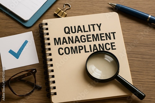 Quality Management Compliance: A notebook with the words "Quality Management Compliance" lies open, accompanied by a magnifying glass, eyeglasses, pen, and checklist.