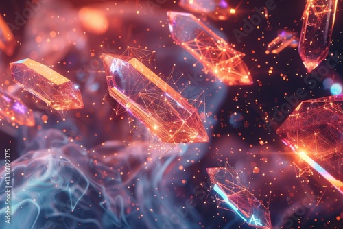 Quantum computing calculations manifest as crystalline qubits interconnected by energy, cyberpunk style noise fills the scene.