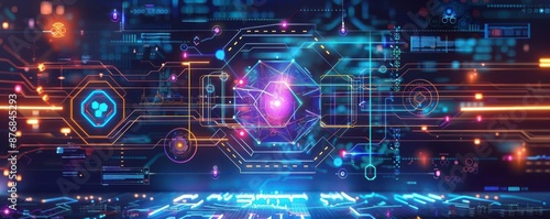 Quantum mechanics symbols intertwined with futuristic AI holograms, cyberpunk aesthetic, neon lights, high-tech, digital illustration, blue and purple tones