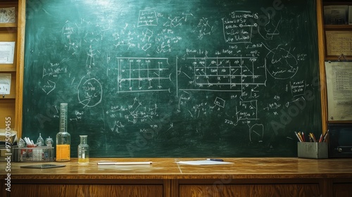 Quantum Physics Formulas Handwritten on Blackboard. AI generated illustration