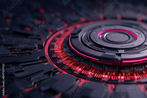 Quantum programming concept with futuristic circuit board and glowing red elements, abstract technology background, innovation and energy