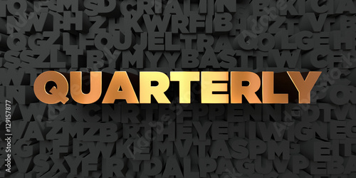 Quarterly - Gold text on black background - 3D rendered royalty free stock picture. This image can be used for an online website banner ad or a print postcard.