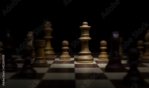 Queen fighting on the chessboard. Low-key concept picture of chess pieces taken in studio and concerning decision making and strategy.