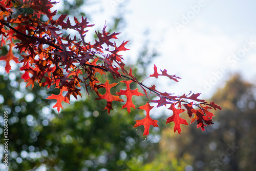 Quercus coccinea bright color red leaves during autumn season in daylight, ornamental tree