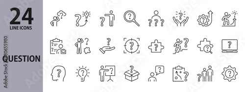 Question line icons set with Question Mark, Problem, Wonder, Puzzle, Query, Object, Confused Person, Think and more. Editable Stroke