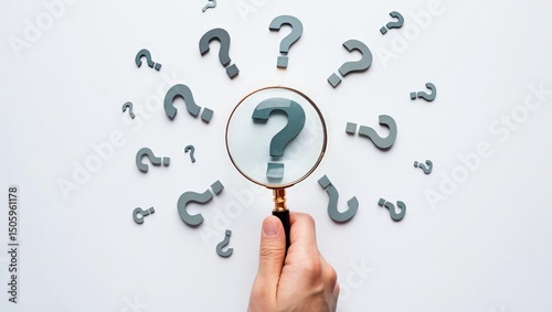 Question mark and root cause analysis concept. Hand holding magnifying glass over large question mark surrounded by smaller ones on white background, symbolizing analysis and problem-solving. solution