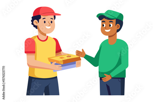 Quick Pizza Delivery: A vibrant cartoon illustration captures the essence of swift and reliable food delivery, as a cheerful delivery person hands over a fresh pizza box to an awaiting customer.