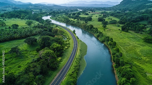 quiet country road that follows the edge of a serene river.
