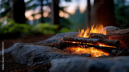 Quiet moment by campfire glows warmly with burning wood and flickering flames in natural outdoor setting