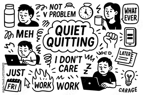 Quiet quitting doodle with office workers, minimal effort, work life balance and burnout symbols, Transparent Background