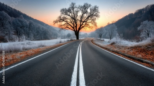 quiet road stretches through a serene winter landscape. sun sets behind frost-covered hills, casting warm colors in the sky, while a solitary tree stands tall amidst the chill