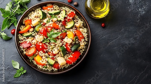 Quinoa salad with fresh vegetables and olive oil on dark background