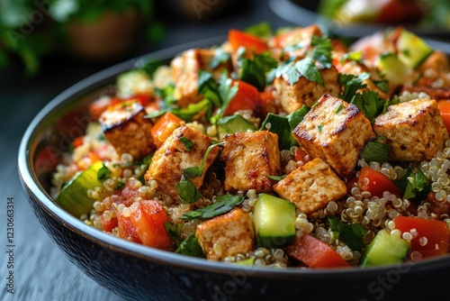 Quinoa salad with roasted tofu, cucumber, tomatoes and fresh parsley in a bowl