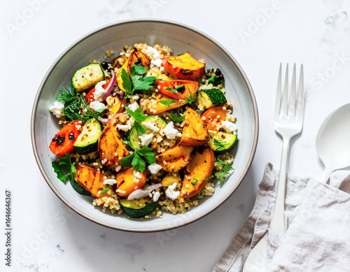 Quinoa salad with roasted vegetables, feta cheese, and fresh herbs, served on a white ceramic plate