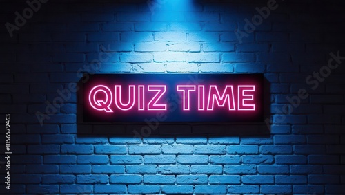 Quiz Time neon sign glowing on a blue brick wall.