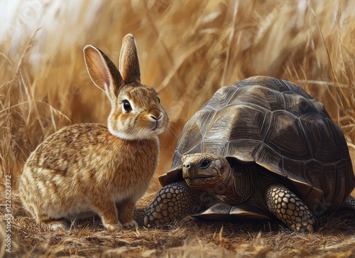 Rabbit and Tortoise in Serenity of Nature, Surrounded by Golden Grass, Captivating Wildlife Moment in the Warm Glow of the Evening Light