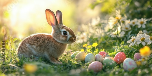 Rabbit exploring colorful Easter eggs in a vibrant garden filled with blooming flowers during spring morning