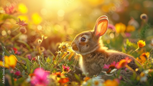 Rabbit in a colorful meadow with flowers at sunset, serene nature scene