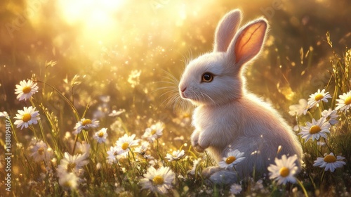 Rabbit Sitting in Meadow of Daisies with Dreamy Golden Light