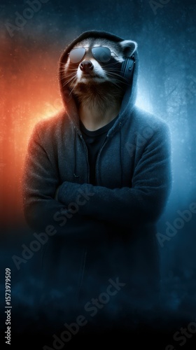 Raccoon in hoodie and sunglasses striking a confident pose in a forest with colorful lighting at dusk