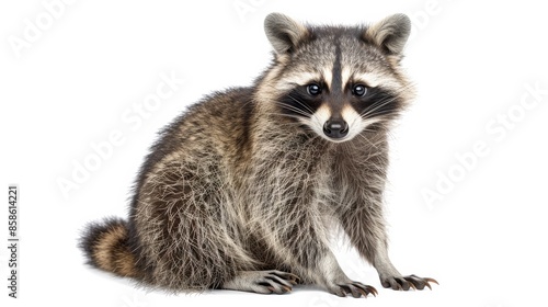 Raccoon sitting on a white background, studio shot. Wildlife and nature concept