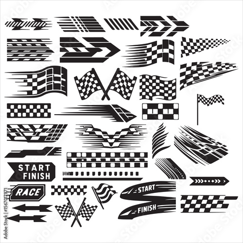Racing Flags and Speed Icons Vector Set – Checkered Patterns, Start Finish Signs, Road Graphics