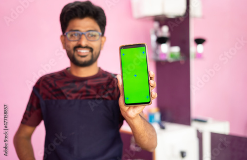 Rack focus from babrer to smatphone, young barber in workwear showig mobile phone with green screen at saloon - concept of advertisement, small businesses, technology and internet