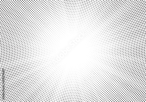 Radial halftone dots. Spotted and dotted stains gradient background. Concentric comic texture with fading effect. Black and white rough gritty wallpaper. Grunge monochrome geometric backdrop.