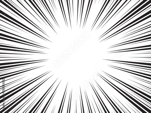 Radial lines comic background. Abstract speed explosion starburst flash backdrop. Sun rays black and white backdrop. Vector Illustration.