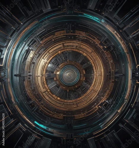 Radial pattern in a futuristic color scheme with metallic accents and high-tech visuals, illustration styles, radial designs, comics art, metallic finishes