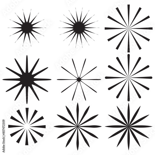 Radial sun burst. Black-white round sunburst icons. Starburst circles. Abstract stripes with center. Sunburst elements isolated on white background. Circular stars. Vector. EPS 10.