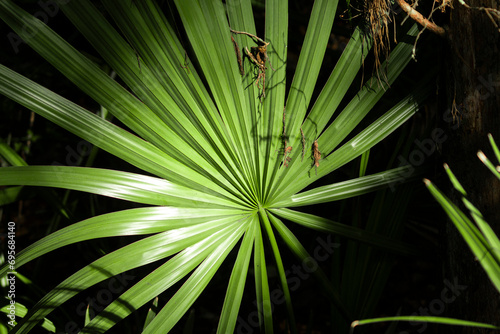 Radials of leaves, made bright by light in the dark forest. Palmate arrangement, large palm shaped leaf in swamps of Alabama. Moody scene with bright warm sunlight