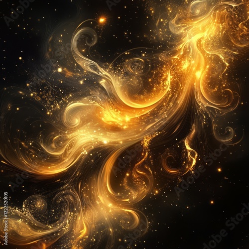 Radiant abstract golden swirls with sparkling accents on a rich black background