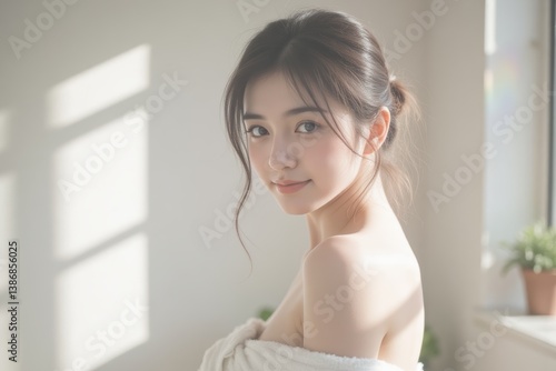 Radiant Asian Woman Wrapped in Towel by Window Light, Soft Glow, Beauty & Self-Care, Morning Routine, Indoor Portrait, Natural Lighting